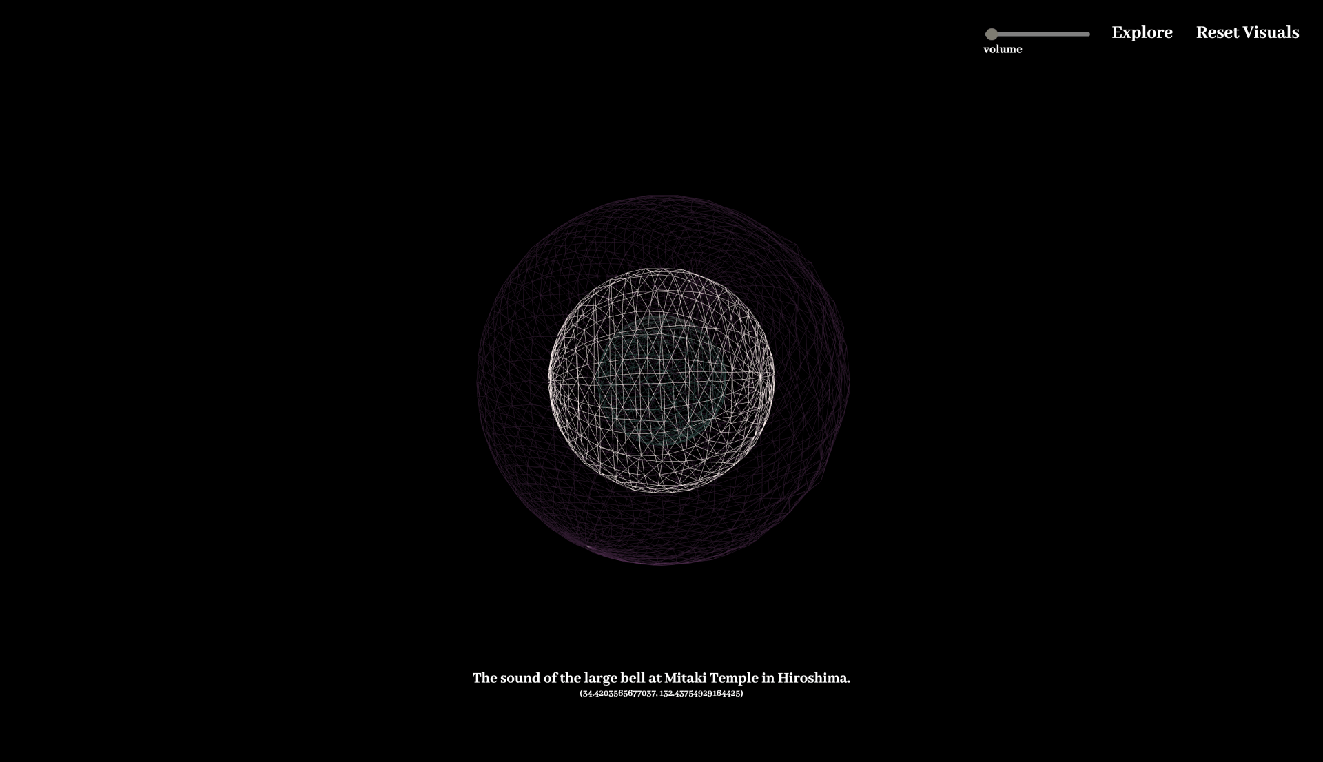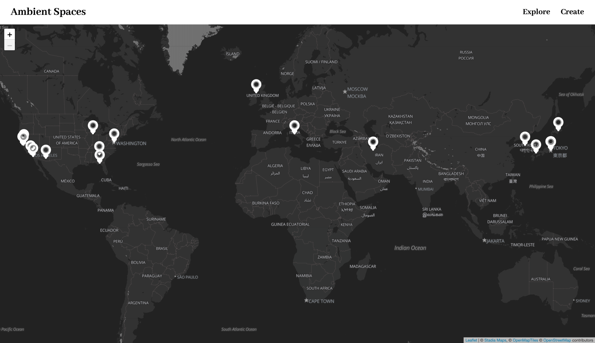 Visitors can click on the world map to explore the memories submitted by users which reveals itself as an audio visual experience. Visitors can simply explore, or add their own sound file using the create button.